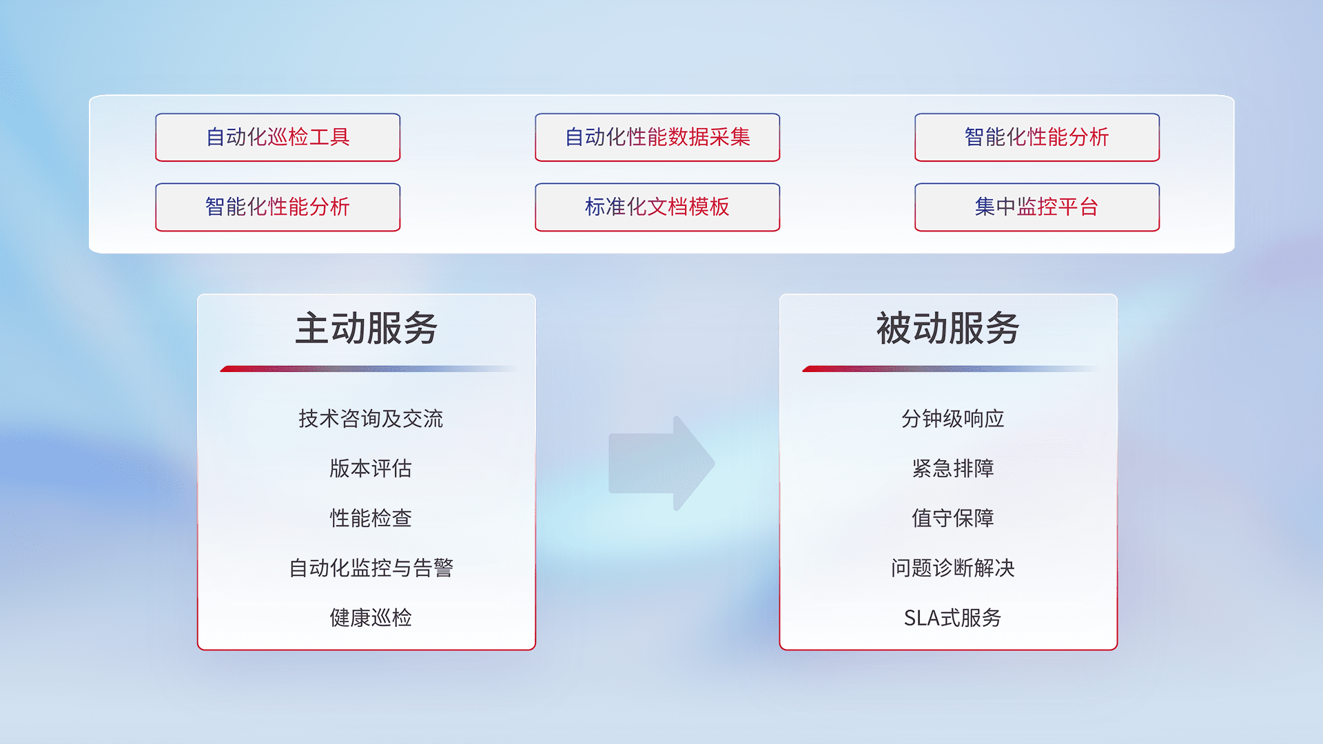智能化工具和标准化文档,,,,保障服务质量,,,提供主动服务(包含技术咨询、、、、版本评估、、、、性能检查、、自动化监控与告警、、、、健康巡检)和被动服务包含(分钟级响应、、、、紧急排障、、值守保障、、、问题诊断解决、、、SLA服务)。。。